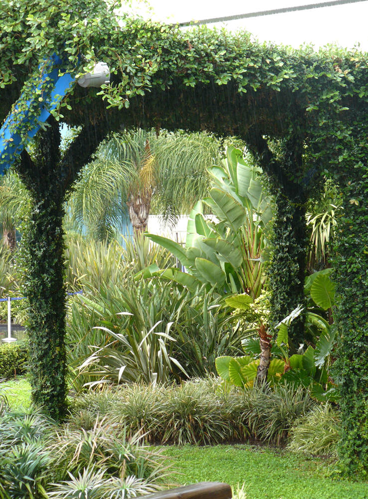 Este es un ejemplo de un verdadero jardín ejecutado sobre la losa de un aparcamiento subterráneo. Las cubiertas y azoteas deberían ser, siempre que fuera posible, verdes. En función de su resistencia pueden ser simples cubiertas verdes o verdaderos jardines. Incluso cubiertas industriales o agrícolas de muy escasa resistencia e imposible circulación por ellas, pueden cubrirse de verde con sistema que no pasan de los treinta y cinco kilogramos por metro cuadrado.