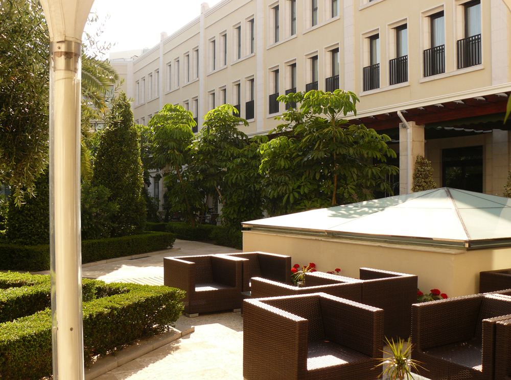 El Patio del Hotel tiene una superficie de 1.800 m2, si bien la mayor parte de ésta se sitúa sobre la losa de hormigón del sótano, lo que representa la mayor dificultad para la construcción del jardín, ya que solo se dispone de un espesor muy limitado de suelo para la vegetación. Solamente el área central, de unos 400 m2 está libre de elementos construidos, permitiendo el desarrollo de elementos vegetales de gran porte. El resto del jardín tiene que adaptarse a la ausencia de suelo por medio de la construcción de jardineras impermeabilizadas cuyo espesor apenas alcanza los treinta centímetros.