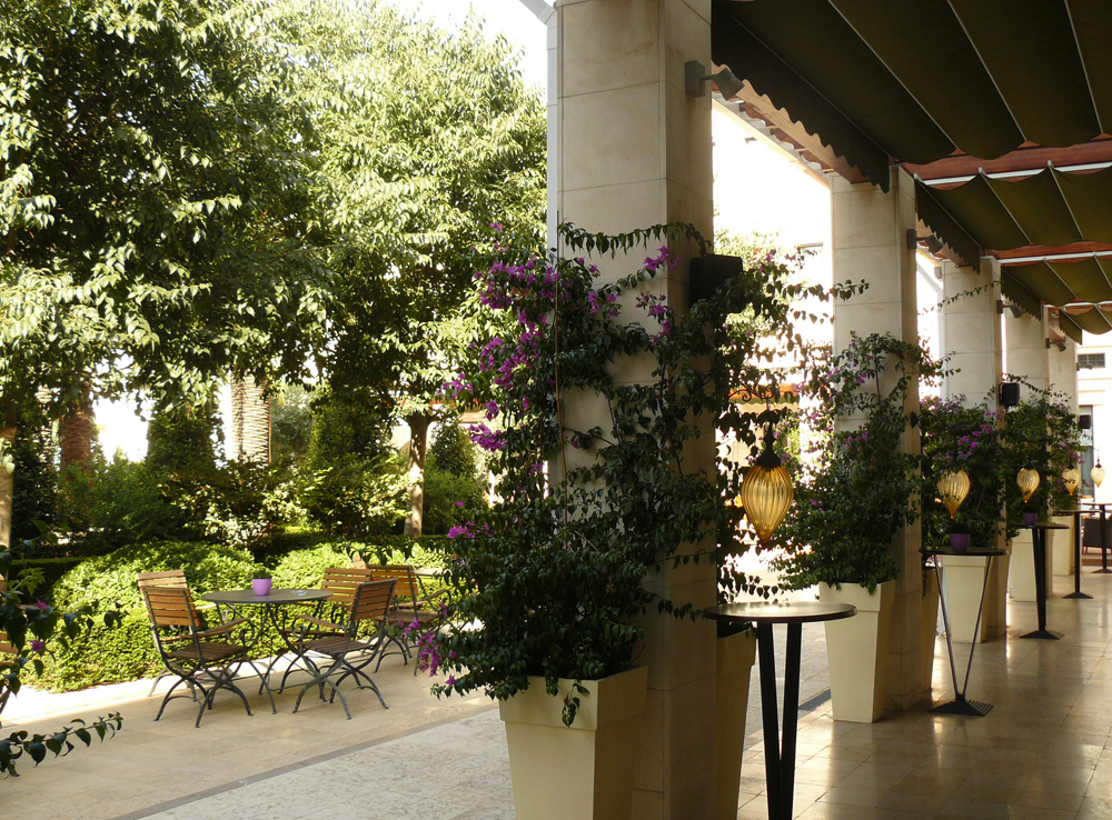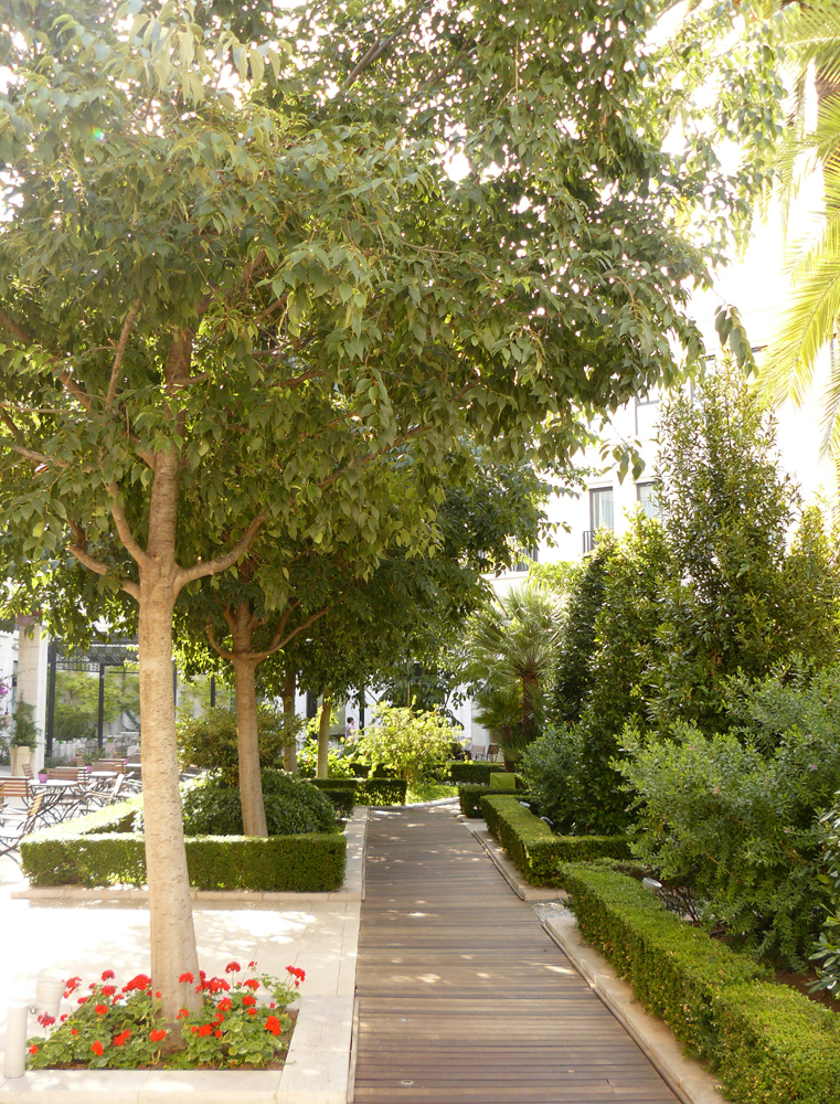 Es más, muchos de los ejemplares plantados deberán ser sustituidos a medio plazo, cuando agoten su capacidad de desarrollo en tan escaso volumen de suelo fértil. Triste final para una colección de planta de primera calidad: suelo inexistente; pérgolas sin sombra; materiales sin la calidad adecuada; fuentes ajenas al conjunto; en definitiva, una nueva ocasión perdida de que la ciudad cuente con algo realmente a la altura de lo que se pretendía inicialmente. El quiero y no puedo de siempre desparramado por los mil ochocientos metros cuadrados del Patio de un Hotel que se supone de Gran Lujo. Quizá sea ese el verdadero “estilo de jardín valenciano”, por lo menos el del siglo XXI: el estilo “quiero y no puedo.” El único consuelo es que el Patio actual sigue disponiendo, al fin y al cabo, de la estructura básica para la ejecución de un Jardín al estilo valenciano clásico, como los de antes.