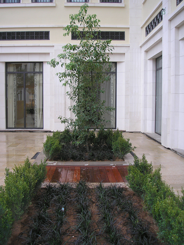Por fin llegó el día de iniciar las obras de ejecución del Patio y del Jardín del Hotel Westin Valencia. Debido a los plazos previstos para la construcción del edificio del Hotel, tuvo que adelantarse la plantación de las palmeras, para hacerlas coincidir con las condiciones climáticas más apropiadas para ello. El inconveniente, lógicamente, era que iban a convivir durante casi un año con el resto de las actividades constructivas: polvo, golpes, vibraciones, etc. Los ejemplares, eran de una calidad exquisita, perfectamente enraizados y transportados en muy buenas condiciones. Conviene comentar que la palmera canaria (Phoenix canariensis) es una de las especies de palmera cuyo transplante de ejemplares de gran tamaño es más complejo y de difícil éxito. Afortunadamente, y pese a la cautela que debe mantenerse en estos casos hasta que no hayan transcurrido dos o tres años, todas las palmeras plantadas en el Patio del Hotel Westin Valencia han enraizado con éxito y, casi un años después del transplante, todas ellas han brotado y presentan sus nuevas palmas, para tranquilidad de todos, pues sería prácticamente imposible realizar la reposición de alguno de los ejemplares con el Hotel ya terminado.